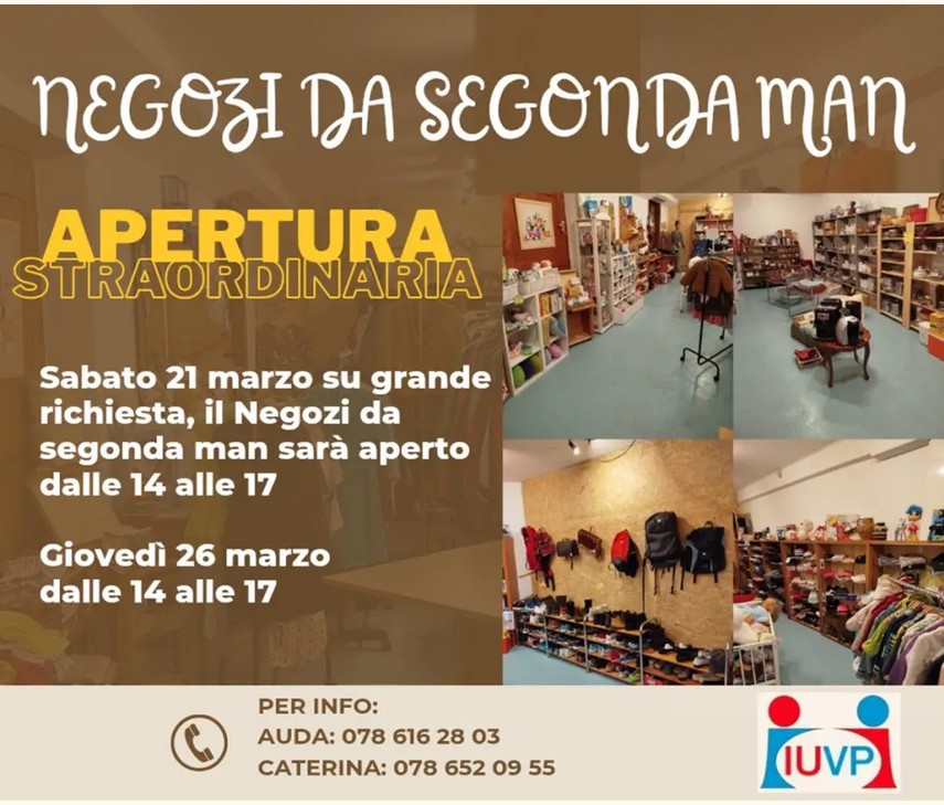 Ai Magazzini IUVP abiti, accessori e oggetti usati in buono stato. Apertura straordinaria sabato 21 e giovedì 26 marzo 2026